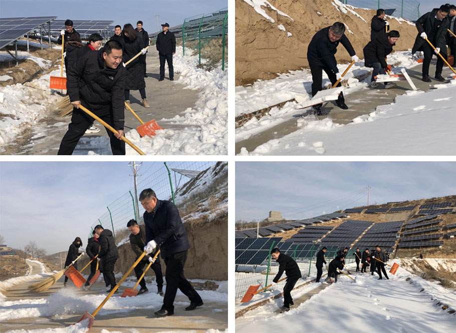 電站所有的組件上也布滿了厚厚的積雪,雪落在組件上會導致組件的陰影遮擋,造成組件發電量的缺失,為了避免損害光伏組件表面,大家用柔軟的掃帚掃除表面的積雪,又用布拖把等工具將表面打掃干凈。看著所有的積雪被清理干凈,大家心里很有成就感。一切為了電站的正常運營